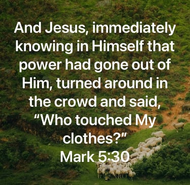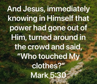 In Mark 5, we read that Jesus was on His way to heal Jairus’ dying daughter. I would call that a pretty big deal, right?! He had somewhere to be! Along the way, there was a woman who had an issue of blood for twelve years and when she heard about Jesus (this makes me excited!), she sought Him out, found Him, and came behind Him in the crowd. She had so much faith!! She knew if she could just touch His clothes, she would be made well. I can see her now, pushing through the crowd, doing whatever she could to just get close enough… And there He was, within her reach! Then, she did it! She touched His clothes!! And Jesus, immediately knowing in Himself that power had gone out of Him turned around in the crowd and said, “Who touched My clothes?” (Mark 5:30).